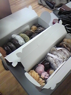 群がる一同。その騒ぎの下で、いち早くドーナツにかぶりつく劇団員・はとちゃん。まるでコソ泥です(笑)そしてカメラを構える私も、左手にはドーナツ。