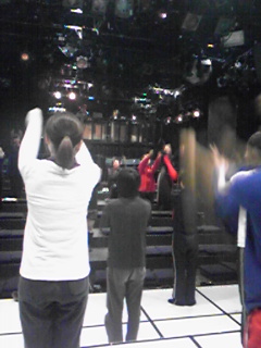 舞台と客席わ使ってラジオ体操しています。